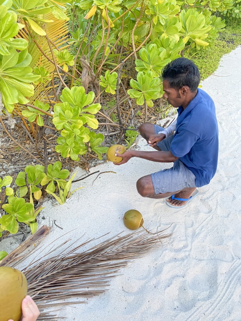 Zu Fushifaru gehört auch eine eigene Sandbank. Ein paar Kilometer vor der Insel habt ihr einfach nur Strand und Robinson-Cruseo-Feeling für euch allein. Und dazu ein feines Picknick mit frischem Obst, Säften und natürlich Coconuts.