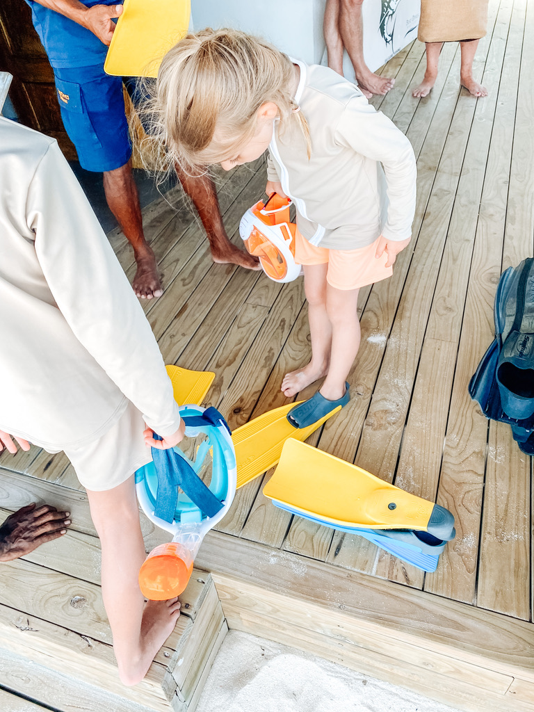 Auch die Kinder bekamen eine kindgerechte Schnorchel-Ausrüstung, dazu kleine Schwimmwesten. Das war vielleicht ein Erlebnis, als wir gefühlt am offenen Meer genau an der Riffkante ins Wasser gelassen wurde mit über 10 Meter Tiefe. Dort haben wir dann riesige Wasserschildkröte, jede Menge bunte Fische, Korallen und sogar kleine Riff Haie bestaunt.