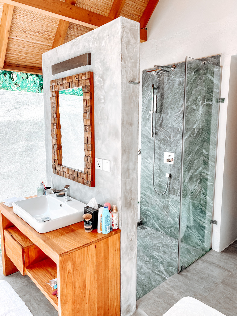 Aber nicht nur der eigene Pool ist ein Highlight, sondern vor allem das offene Außen-Badezimmer ist ein absoluter Traum. WC und Waschtisch sowie eine der Duschen sind von der Überdachung vor Regen geschützt. Und dann habt ihr da noch eine traumhafte freistehende Badewanne und eine Outdoor-Dusche. Die Größe der Villen liegt bei 96m bis 122m2. Die Beach Duplex Villa, bestehend aus 2 Villen und einem Pool, verfügt zusätzlich zu den 2 Schlafzimmern über einen Verbindungsraum mit Wohnbereich und ist ideal, wenn ihr mit mehr als 4 Personen hier seid.