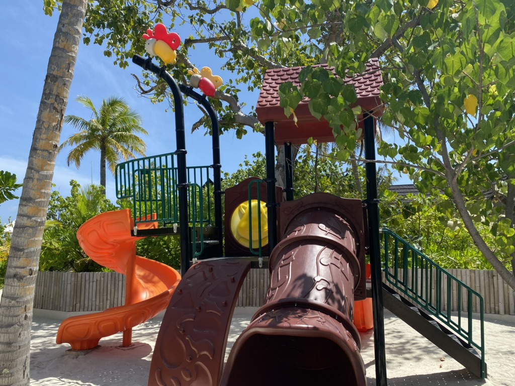 Mitten im Grün der Inselmitte erwartet euch auf Fushifaru nicht nur ein eigener Inselarzt, sonder auch der Kids Club. Der ist ganz süß gemacht, allerdings müssen ein paar Palmen und Büsche darum herum erst noch an Größe gewinnen, um auch auf dem Spielplatz etwas mehr Schatten zu spenden. Der Spielturm mit der Rutsche wurde tagsüber doch recht heiß und war vor allem morgens oder in den Abendstunden ideal.
