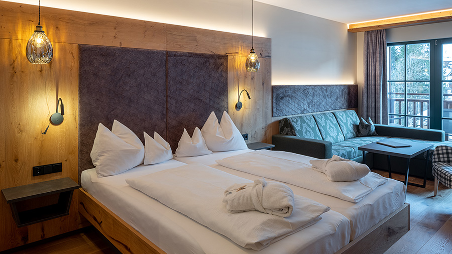 Das Hotel verfügt neben Doppelzimmern, über mehrere Familienzimmer mit zwei separaten Schlafzimmern. Manche sind traditionell eingerichtet, andere erscheinen in einem modernen Look. Wer mit nur einem Kind unterwegs ist, wird sich über ein Doppelzimmer mit Zustellbett freuen und wer mehr Platz benötigt, für den sind die Familienzimmer perfekt.