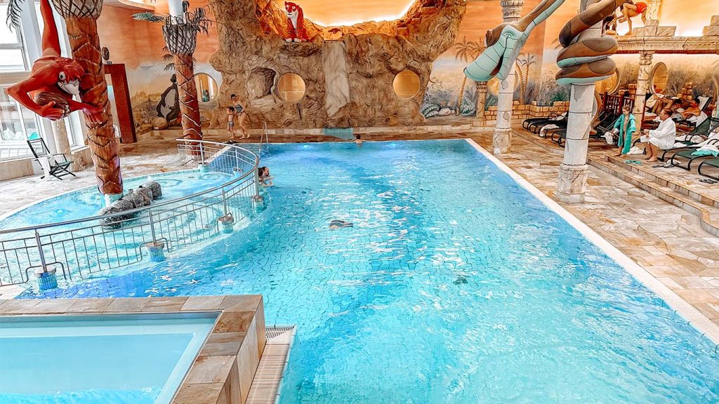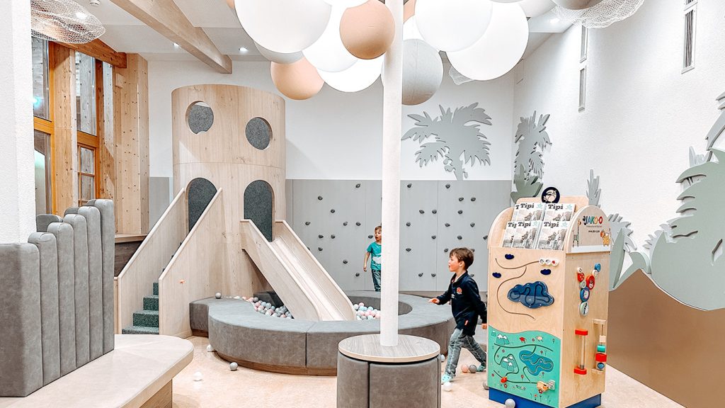 Trotz der vielen Familien im Hotel, verteilst sich alles gut und der Lärmpegel hält sich sogar entgegen meiner Erwartungen in Grenzen. Das liegt vielleicht auch daran, dass sich die Kinder am liebsten im wunderschönen Kinderland aufhalten oder nachmittags im Schwimmbad mit der großen Wasserrutsche plantschen.