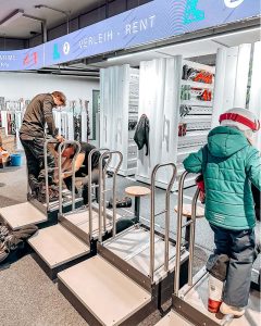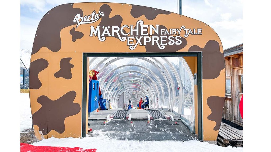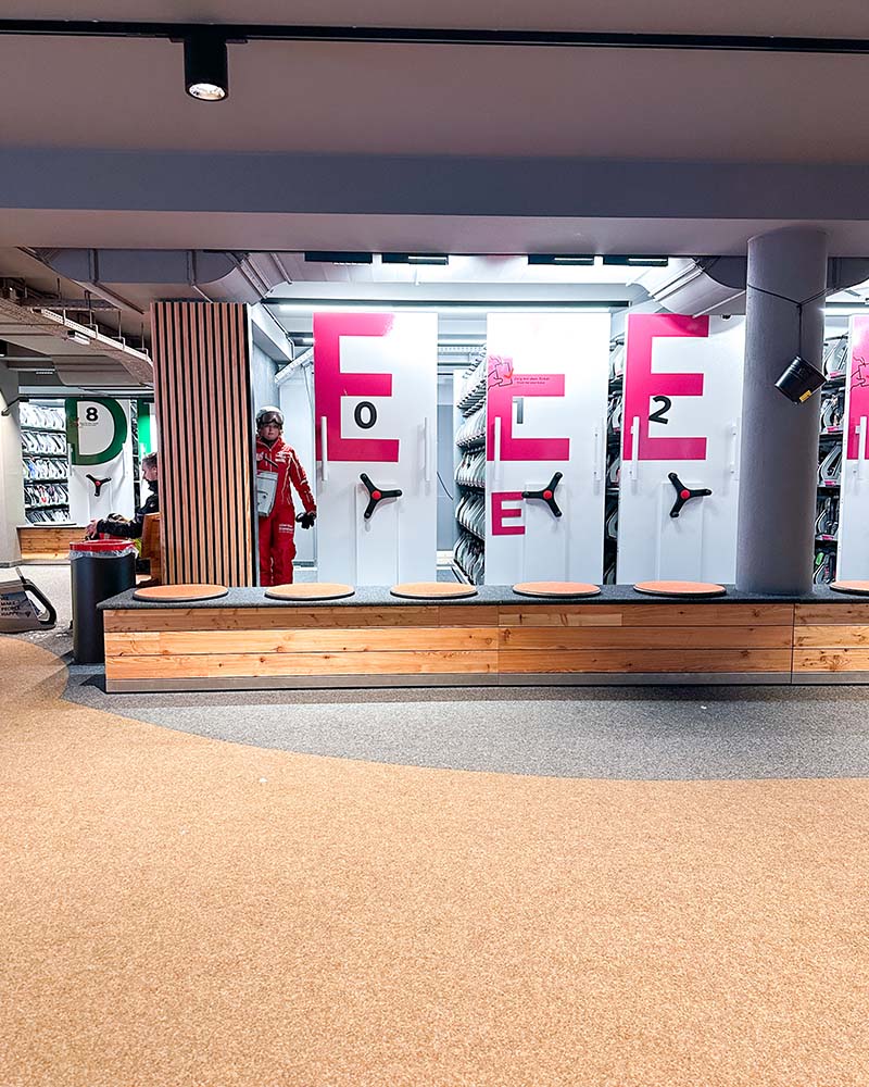 Der Ski-Verleih am sogenannten Check-In Store unterhalb der Seilbahnen in Serfaus ist großräumig und wunderschön modern. Hier bekommt ihr die neueste Ausrüstung von Top-Marken, alles ist sehr strukturiert und gut organisiert. Sogar das Skidepot ist eine Erwähnung wert, denn ihr bekommt spezielle Aufbewahrungsboxen für eure Schuhe, Ski-Helme und Handschuhe, die während des gesamten Urlaubs für euch reserviert sind. Schluss mit lästigem Sitzen vor irgendwelchen Spinden. Hier habt ihr einen persönlichen Anlaufpunkt, wo ihr mit QR-Code ratzfatz die Ski oder Snowboards abgebt oder morgens abholt und eine weitere Station für die Schuhe. Besser geht es nicht. Auch das Ticket-Center für die Skipässe befindet sich auf dem Areal. Und das Beste: Ihr müsst in klobigen Skistiefeln keine einzige Treppenstufe mehr gehen. Sowohl in der Tal- als auch auf der Bergstation ist alles, was nicht ebenerdig ist, standardmäßig über Rolltreppen und/oder Aufzüge verbunden. Das erleichtert nicht nur Kindern den Weg ins Skigebiet ungemein.