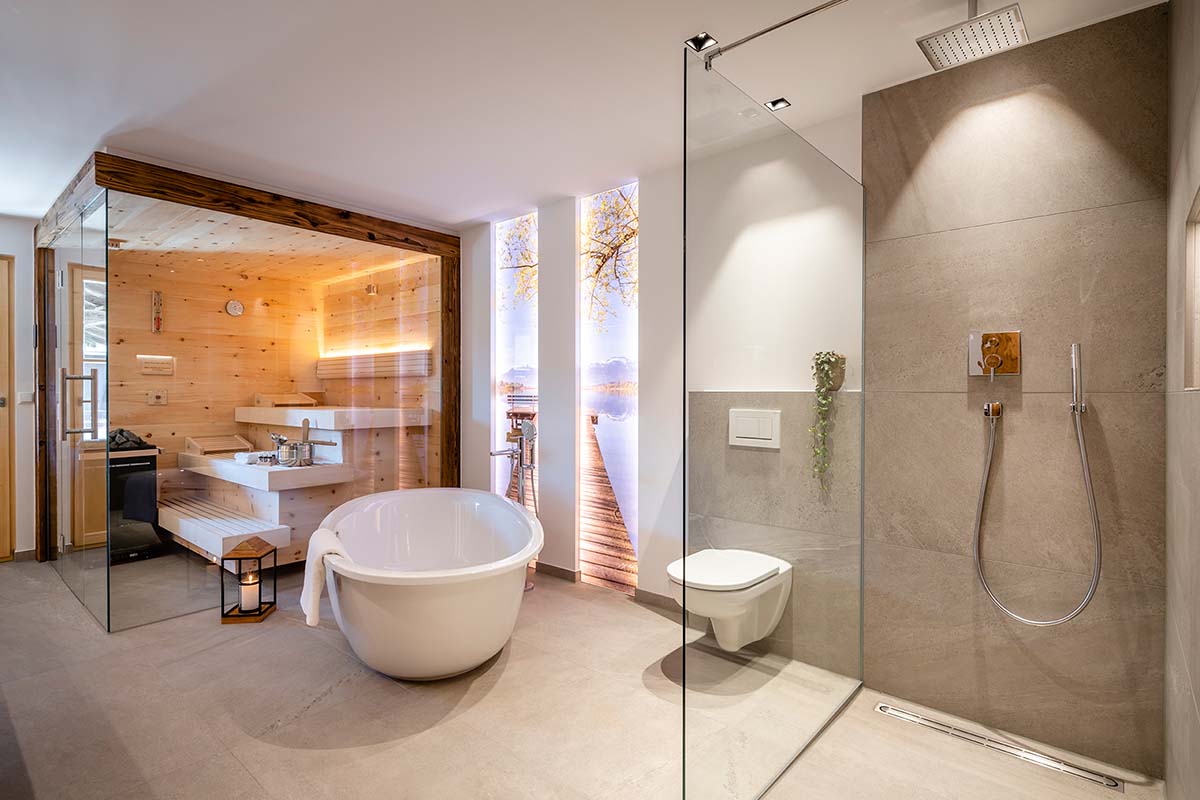 Besonders luxuriös geht es in der Wellness-Ferienwohnung Eule zu. Hier werden Bäder-Träume wahr. Eine eigene Sauna lädt zum Entspannen ein und in der freistehenden Badewanne könnt ihr besonders schön relaxen. Sogar mit Blick auf ein hinterleuchtetes Bild vom Chiemsee.