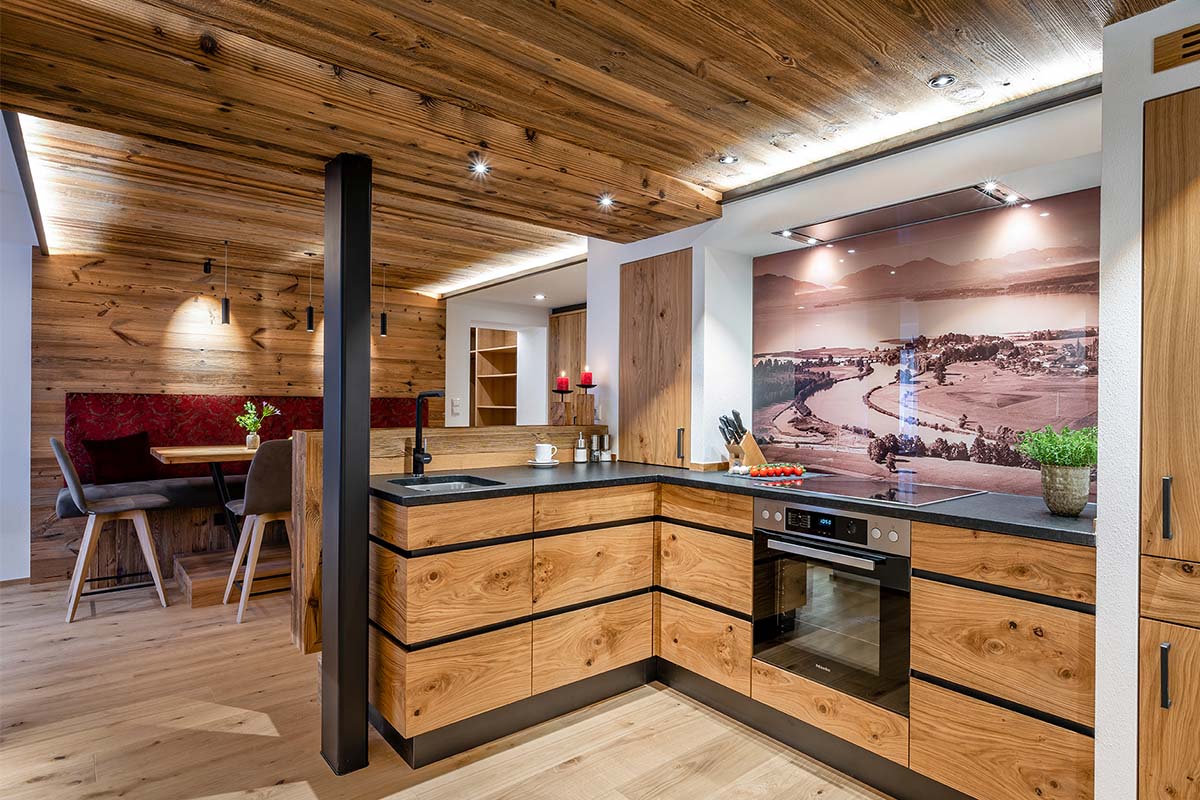 Hereinspaziert in die wunderschönen Luxus-Ferienwohnungen auf dem Moierhof. Passend zum Landleben finden sich in der Einrichtung viele Holzelemente, die jedoch sehr modern wirken und perfekt mit dem durchdachten Designkonzept harmonieren. Natürliche Farben geben den Ton an und perfekt eingesetzte Lichtakzente verleihen den Wohnungen eine stilvolle Gemütlichkeit.